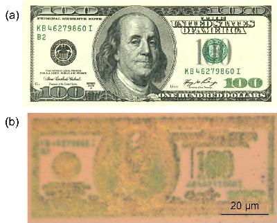 Un billet de cent dollars américain (a) a été reproduit à l'échelle micrométrique (b) par la méthode d'écriture directe par laser LOPA sur une couche d'or. L'image micrométrique est lue par l'effet plasmonique des nanoparticules d'or de taille différente.